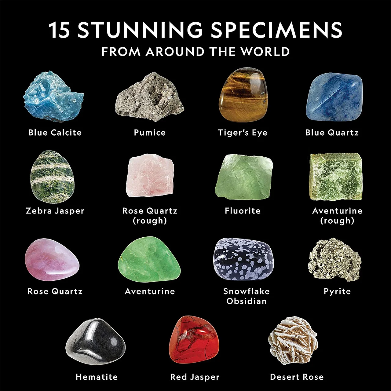 - ULTIMATE ROCK COLLECTION FOR KIDS - A perfect standalone collection or addition to any kid’s rock collection. Includes rough and polished samples of Aventurine, Rose Quartz, stunning Snowflake Obsidian, Desert Rose, Red Jasper, Blue Quartz, Pumice, and meteorite specimens as well. Makes an excellent STEM gift for girls and boys!