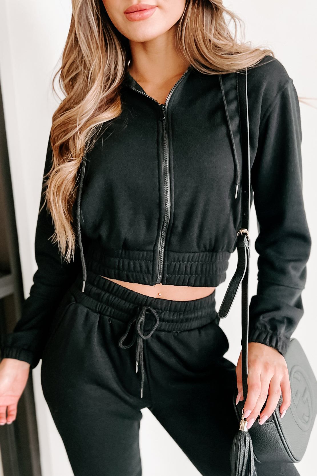 - Top: Drawstring Hood, Zipper Closure, Side Slit Pockets, Elastic Banded Hem, Fleece Lined, Slightly Cropped Fit